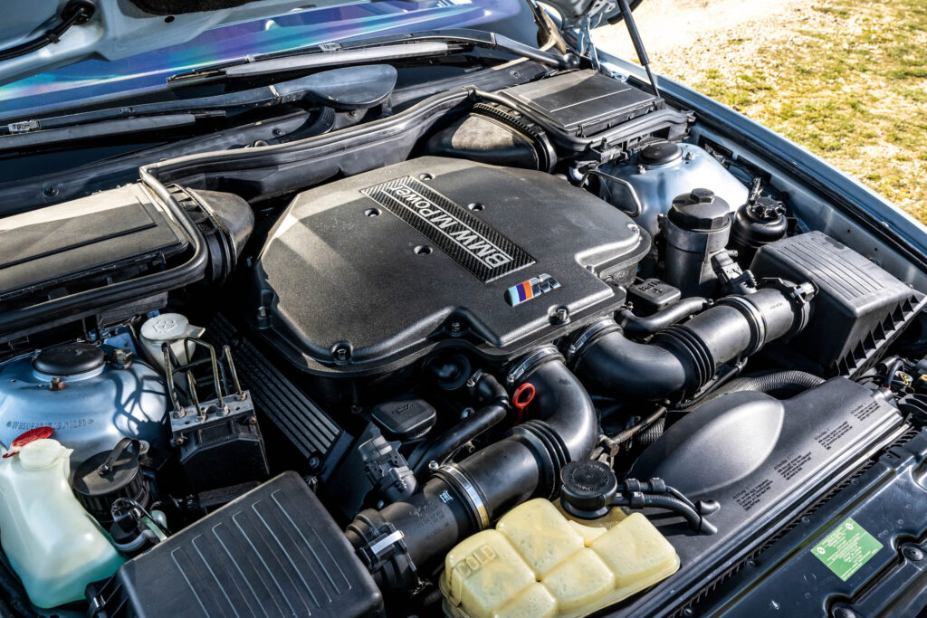M’s take employed the S62 version of BMW’s V8, its first version with variable timing on both intake and exhaust camshafts, and stretched in capacity to 4941cc. Other highlights include dual-row timing chains, individual throttle bodies for all eight cylinders (electronically actuated and with a driver- selected ‘sport’ mode for quicker response), a raised compression ratio, hollow camshafts and a semi-dry oil sump, which consists of two additional scavenging pumps that activate during hard cornering. Peak power you know about; torque tops out at 369lb ft, and it revs all the way to 7000rpm.