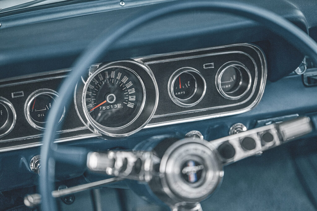 The majority of V8 Mustangs were fitted with a three-speed automatic or, for six-cylinder models, a three-speed manual. The brilliance of Ford’s marketing was to create a seemingly infinite number of options, beginning with the choice of engine – 200ci (3.3-litre) straight-six or a V8, the latter initially a 260ci (4.2 litres) small-block that was superseded by the classic 289ci (4.7 litres) in late 1964 – and running a huge gamut of trim, colours and accessories. It was first available as a hardtop sedan, generally referred to as a ‘notchback’, or a convertible, but a 2+2 fastback coupe quickly joined the range. The fastback’s sportier looks often seduce buyers today but the notchback has a discreet charm of its own. It’s the purist’s choice, which is why design professionals such as Callum and Cameron prefer it.