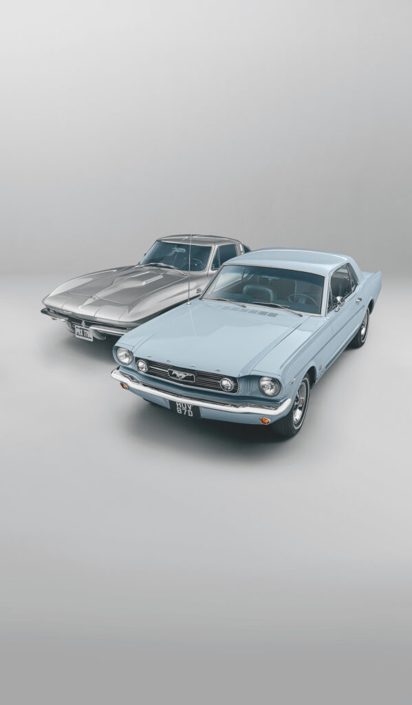 Let’s deal with the elephant in the room first. Or rather, the photo studio. That isn’t meant as a snide dig at either the 1966 Ford Mustang GT or the 1965 Corvette Sting Ray pictured here, but rather as an acknowledgement that, to our American readers at least, the mid-60s Mustang and Corvette are not natural rivals. One was launched as a stylish shopping car, the other as a ‘halo’ sports car from a company renowned for making blue-collar sedans. As Corvette specialist and historian Tom Falconer puts it: translated into UK terms, it’s like comparing a Ford Capri with a Jaguar E-type.