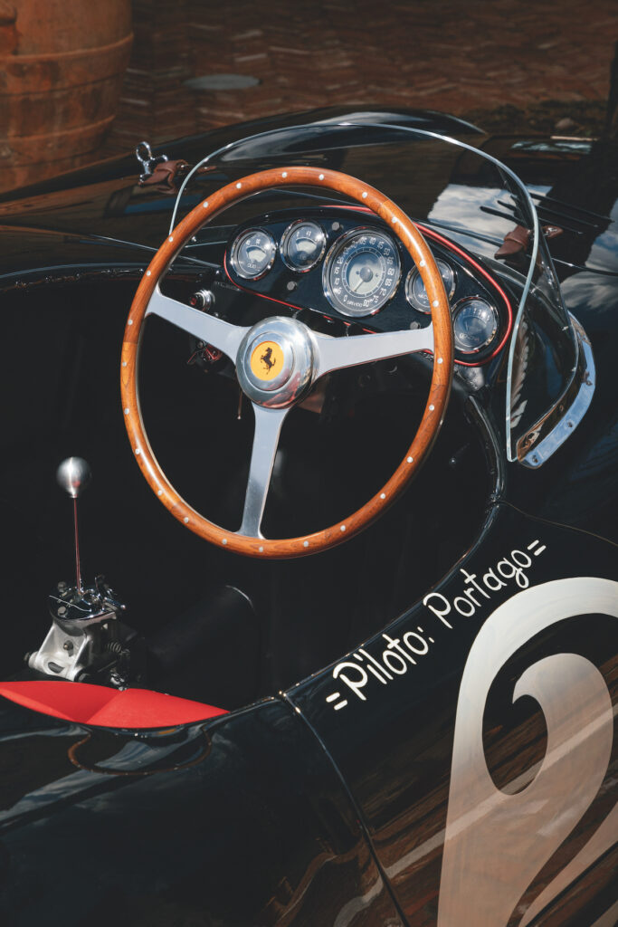 Just one tool in Enzo’s drawer of racing implements, this car was born to live a hard life in Ferrari’s epic battles with Maserati. It wasn’t even created as a 750 Monza originally but rather a smaller-displacement 500 Mondial (hence the MD designation in the chassis number), and the car wasn’t originally black, either, but Scuderia red. Jockeyed by factory shoe Umberto Maglioli, the 500 played its part to further Italy’s resurrection from the ashes of war by notching a win at Imola. That plus a victory