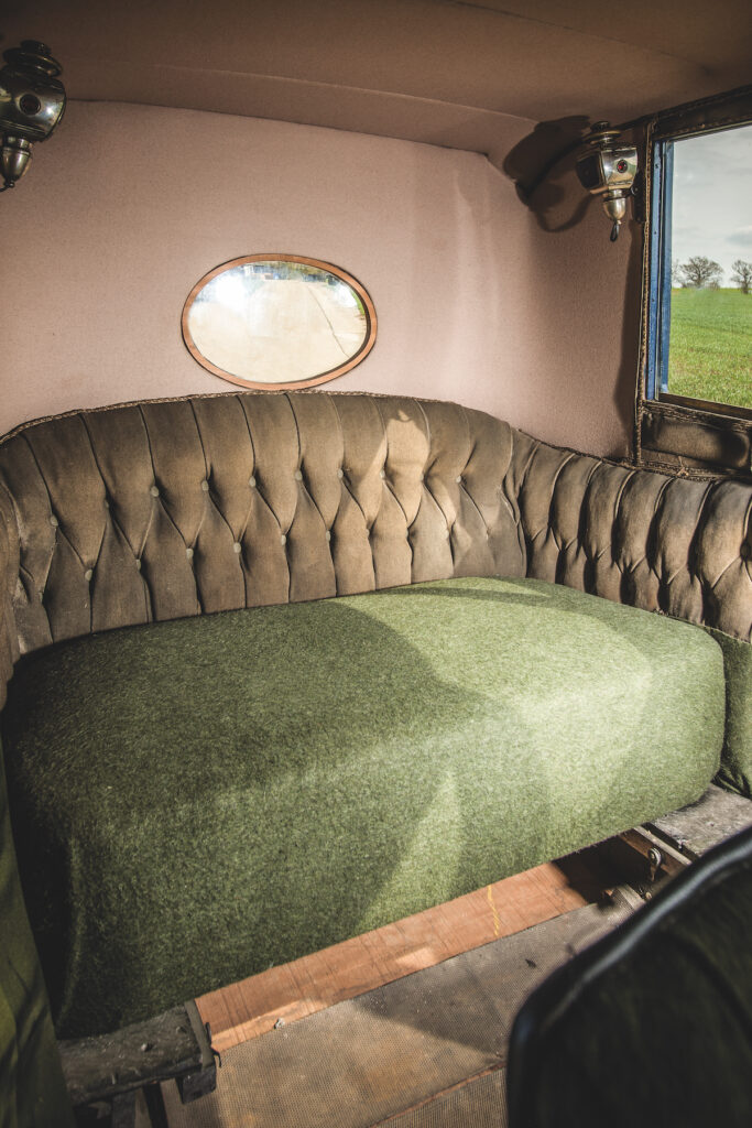 Bob took the body off the chassis and handed it to his employee Dave Unsworth to repair. The basic structure proved remarkably sound, and little of its wood frame needed replacement, only a general tightening of joints being necessary; the guiding principle was to retain as much of the original structure as possible, though some of the external panels had to be repaired or replaced. However, the internal trim was retained, the cloth door panels and rear seatback only needing cleaning, though the driver’s seat and rear seat cushion were in a worse state and were covered over with new woollen cloth to protect them.