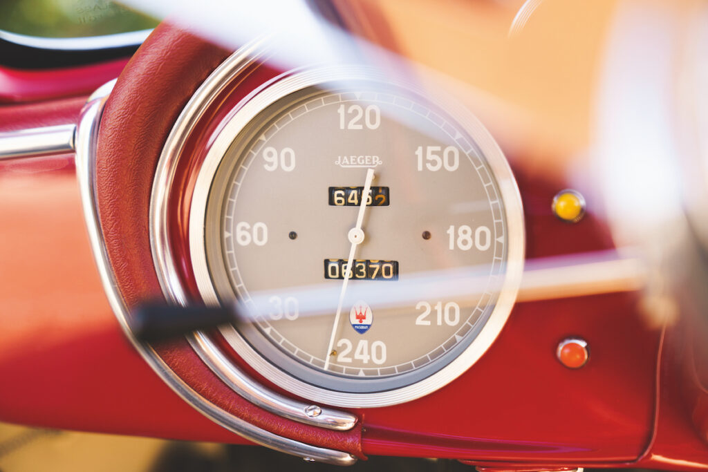 It was ordered in 1956 by Charles Rezzaghi of Mille Miglia Motors Inc of San Francisco, completed on 31 October and shipped out to California, where it subsequently competed in a number of sports car races and later underwent a colour change from red to silver. Rather more drastically, when it was retired from competition in the early ’60s, its then owner, Frank Jay Hoke, replaced the Maserati straight-six with a Buick V8. Which sounds like sacrilege but was purely pragmatic: as such exotics got older, spares were virtually unobtainable, so if the engine broke it was not uncommon to install a home-brewed V8 under the hood. Happily for 2186, a later owner was able to reunite the car with its original engine, and it has since been restored to its original colour scheme and the eye-popping condition you see today.