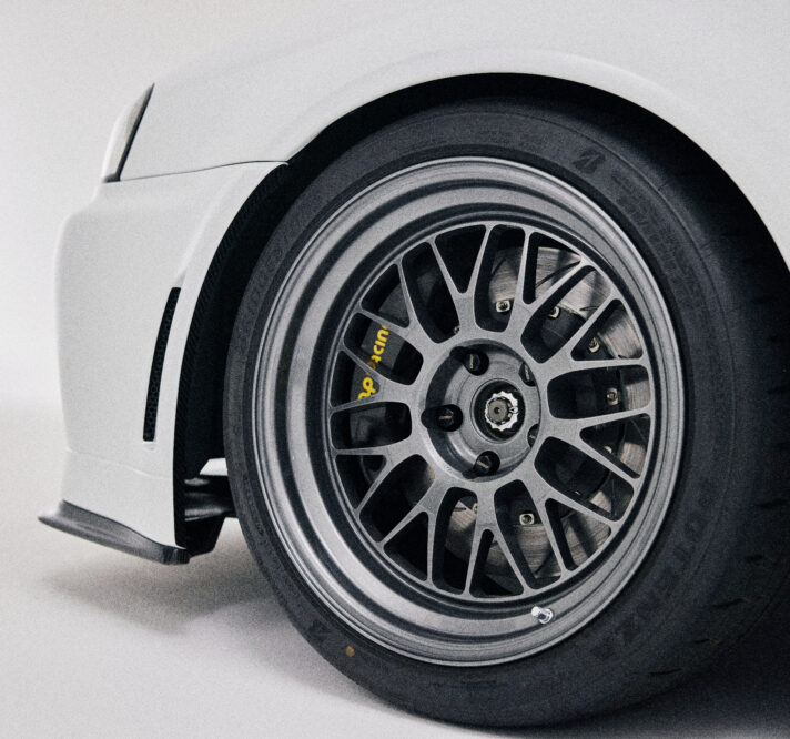 Once fully prepped, the body is painted in Shiranami White Pearl, with the undercarriage painted in the company’s signature BBL Navy. All of the suspension components go through a process of media blasting and powder coating, with new bushes and bearings throughout. An Aragosta Type S suspension set-up is then fitted, along with front and rear AP Racing brake callipers.