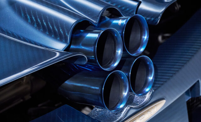 Creation of these bespoke ‘Grandi Complicazioni’ cars – a special division dedicated to the production of one-off cars – requires a close collaboration with the customer, and in the case of this Huayra Epitome, over ten months was spent on the design and engineering. These cars are not simply one-off special colours, wheels and specs, but are thoroughly re-engineered. Rather than simply choosing a blue and gold colour scheme and letting Pagani get on with it, but the customer of this one-off also had a very involved say during the design process, which has introduced some significantly re-worked elements. The front end is re-shaped to improve downforce and cooling, and there’s an integrated rear wing at the back. Also, a new underbody diffuser also works in conjunction with a switchable titanium exhaust system to create an F1-style blown diffuser.